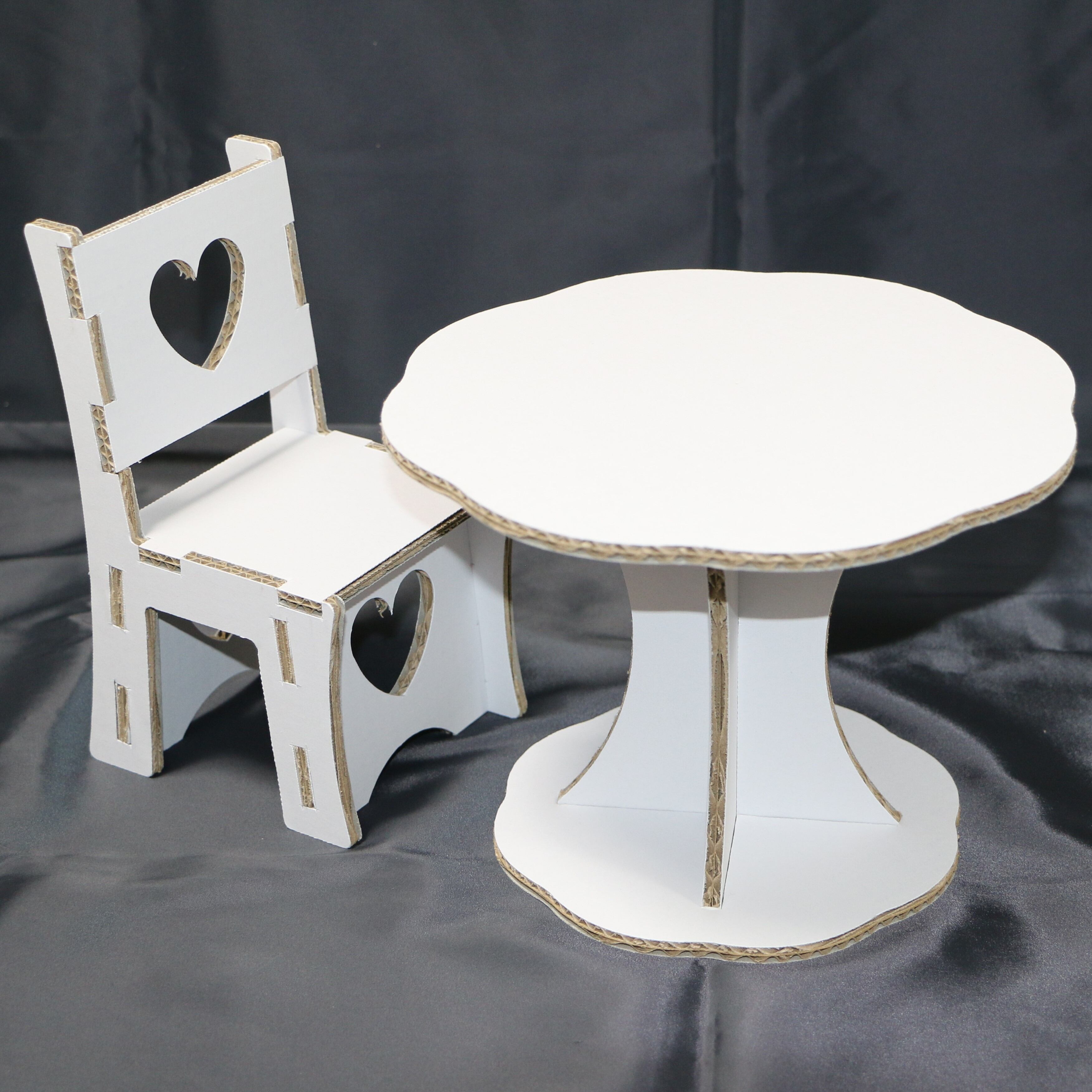 ダンボール製組み立てカフェテーブルセット。女の子たちが好きな人形や小さなぬいぐるみ等に合わせたサイズになっています。はじめに3ミリのダンボールを貼り合わせて6㎜のパーツを作り、出来たパーツに接着剤を注入しながら組み立てます。貼り合わせて作るのでダンボールとは思えないほど丈夫、そして色は白なので装飾もしやすい。お友だちみんなで人形などを持ち寄り、ワイワイ・キャッキャッと楽しい!おままごと遊びができるよ。 接着剤付き・組み立て説明書付き。 サイズ:テーブル高さ15㎝×天板幅20㎝、椅子高さ19㎝(座面9㎝)×幅10㎝×奥行11㎝ カラー:白 *テーブル1台、椅子2脚セットもあります。