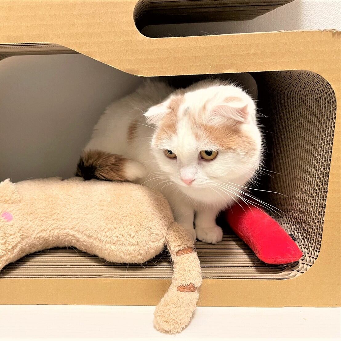 ダンボール製の収納棚です。といっても使用用途はお客様次第。猫ちゃんのくつろぎスペース(爪研ぎ面あり)にもピッタリ、1階・2階スペースと猫ちゃんの頭上と楽しいお家としてもご使用いただけます!