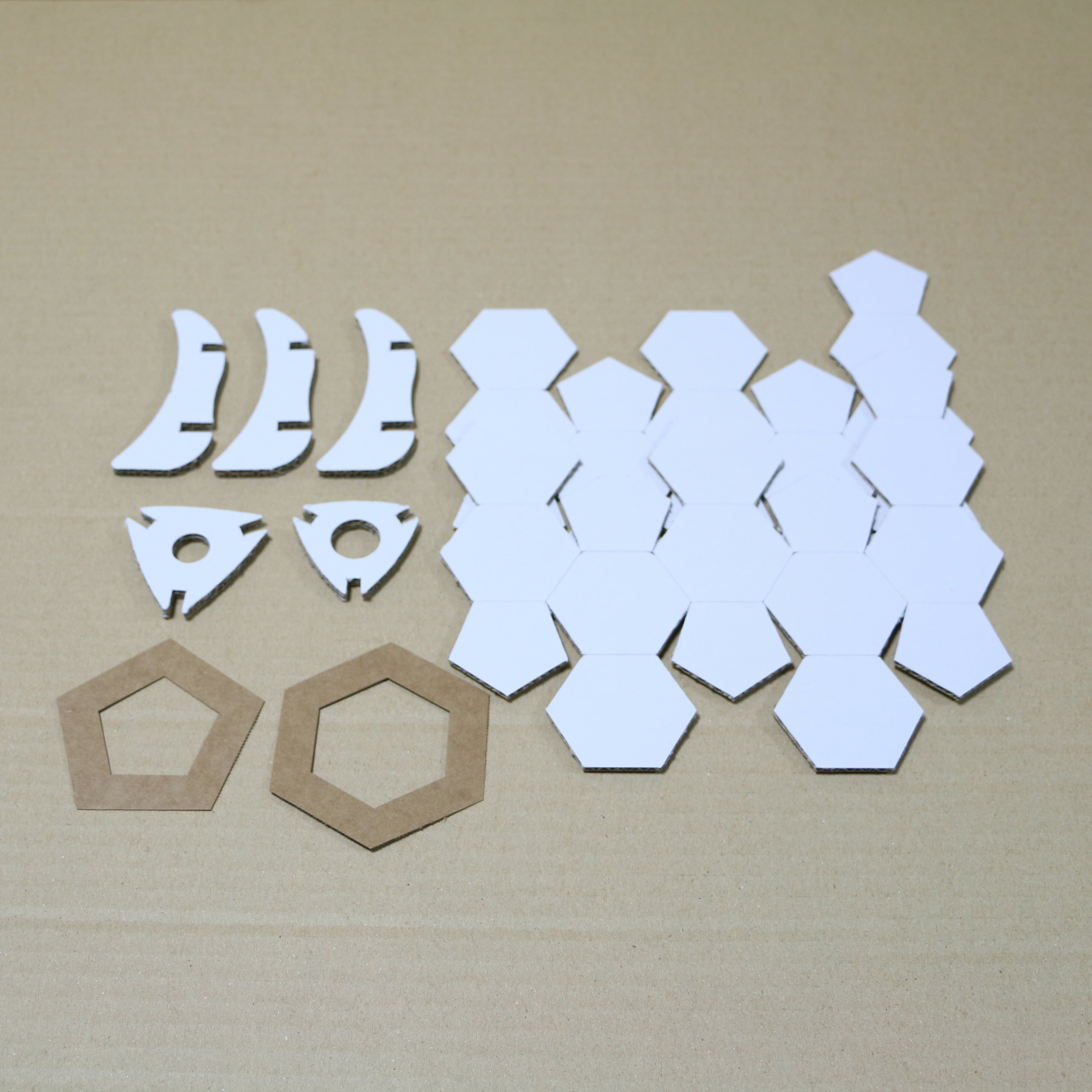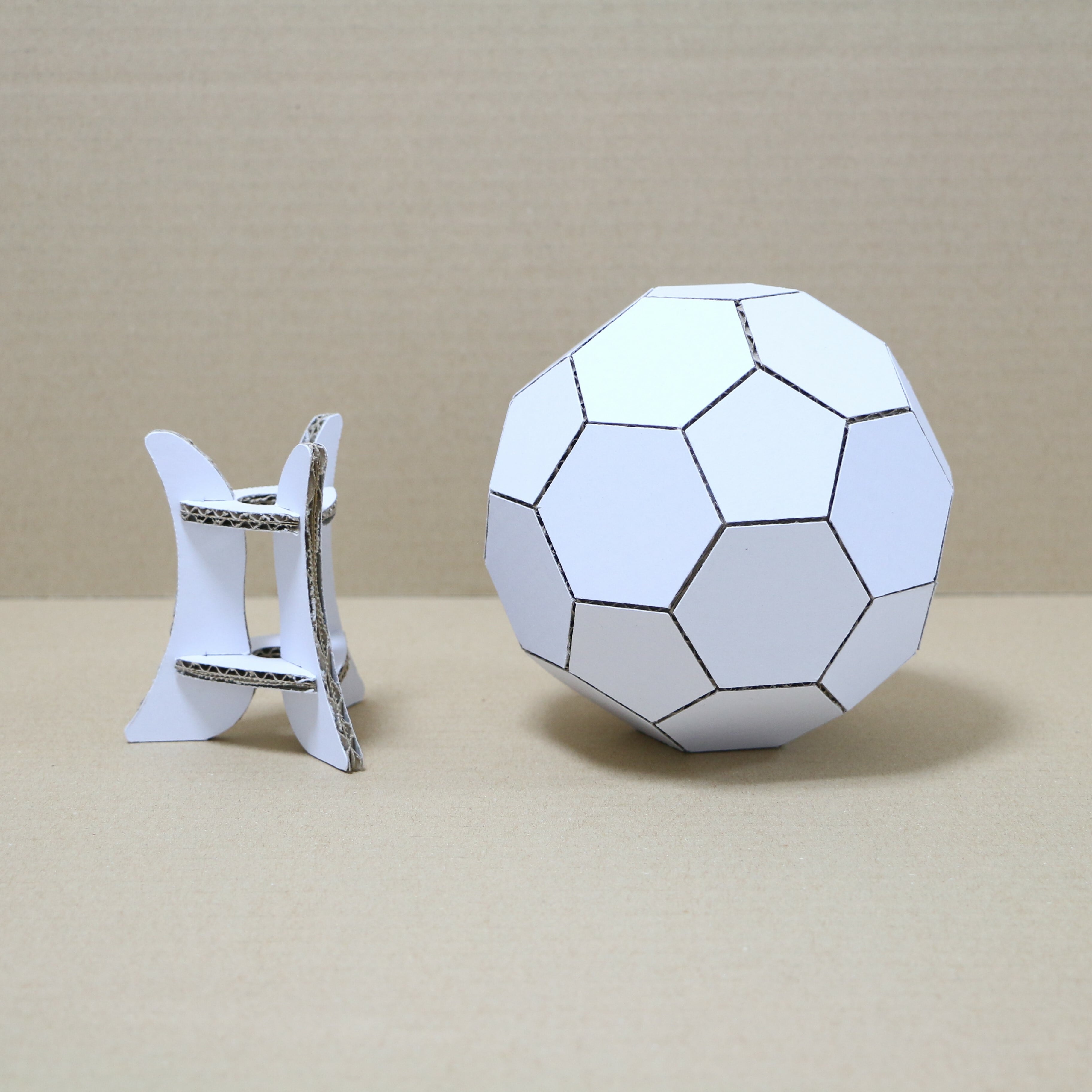 32面体(人分)のメッセージボールとしても使用可能です。ダンボールシートを切り込みが入っている線に沿って折り曲げ、隣り合う辺を丁寧に合わせて接着することでサッカーボールが完成します。組み立てることで、サッカーボールの構造について学ぶことができます。友達や家族、そしてイベントやパーティーなどで楽しむことができます。また、手作りのサッカーボールはプレゼントとしても人気です。用途は様々、月間日記として一日の出来事を1面に記入する、寄書きをしてプレゼントする、オブジェとして飾る、多目的サッカーボールです。色付けをするとカラフルな可愛いサッカーボールに変身します。また、写真を貼ってオリジナルサッカーボールアルバムとしても楽しめます。子どもから大人まで幅広く楽しめる工作キットです。是非、手作りのサッカーボールを体験してください。