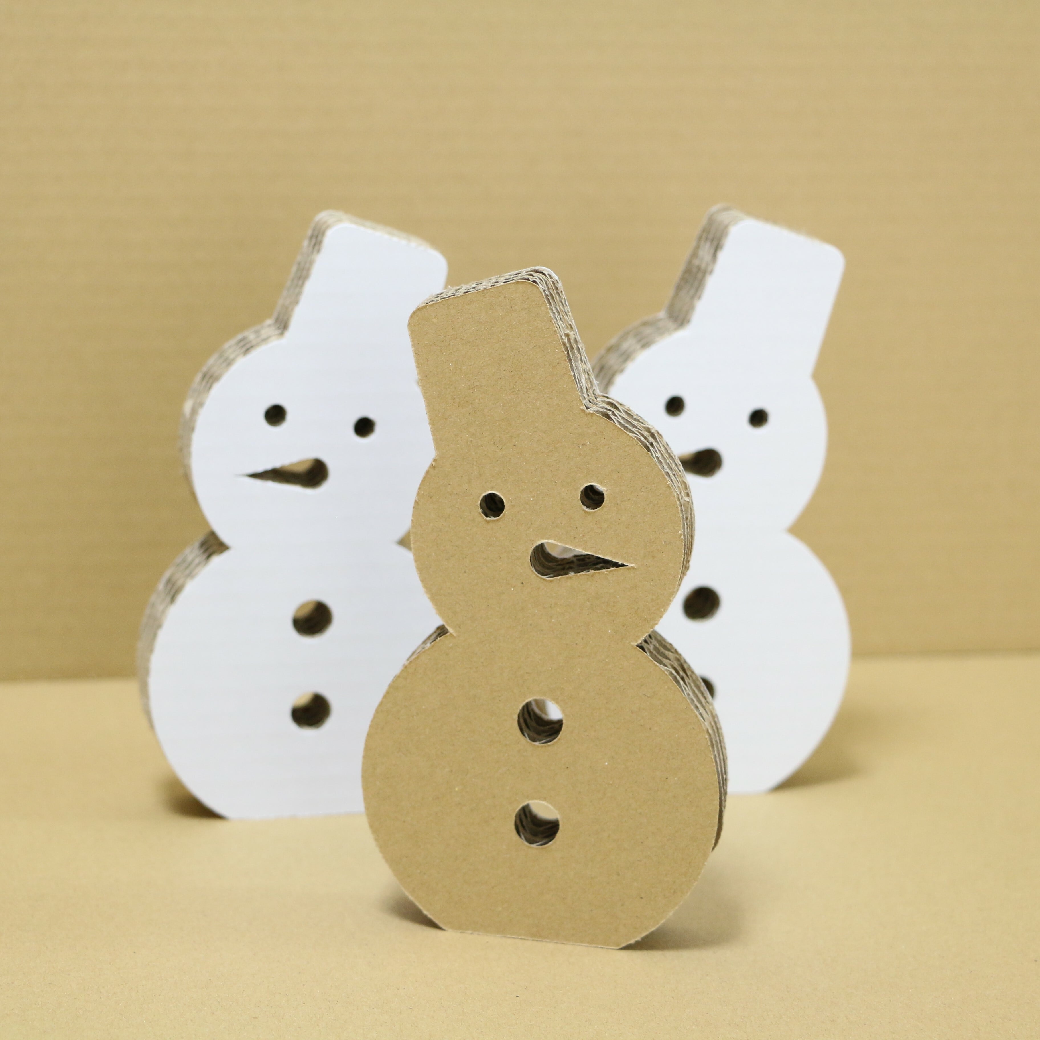 ダンボール特有の質感が暖かく温もりのある雪だるまになっています。色を塗ったり側面に小枝を差し込んだりして、あなただけのオリジナル雪だるまを作ろう!
