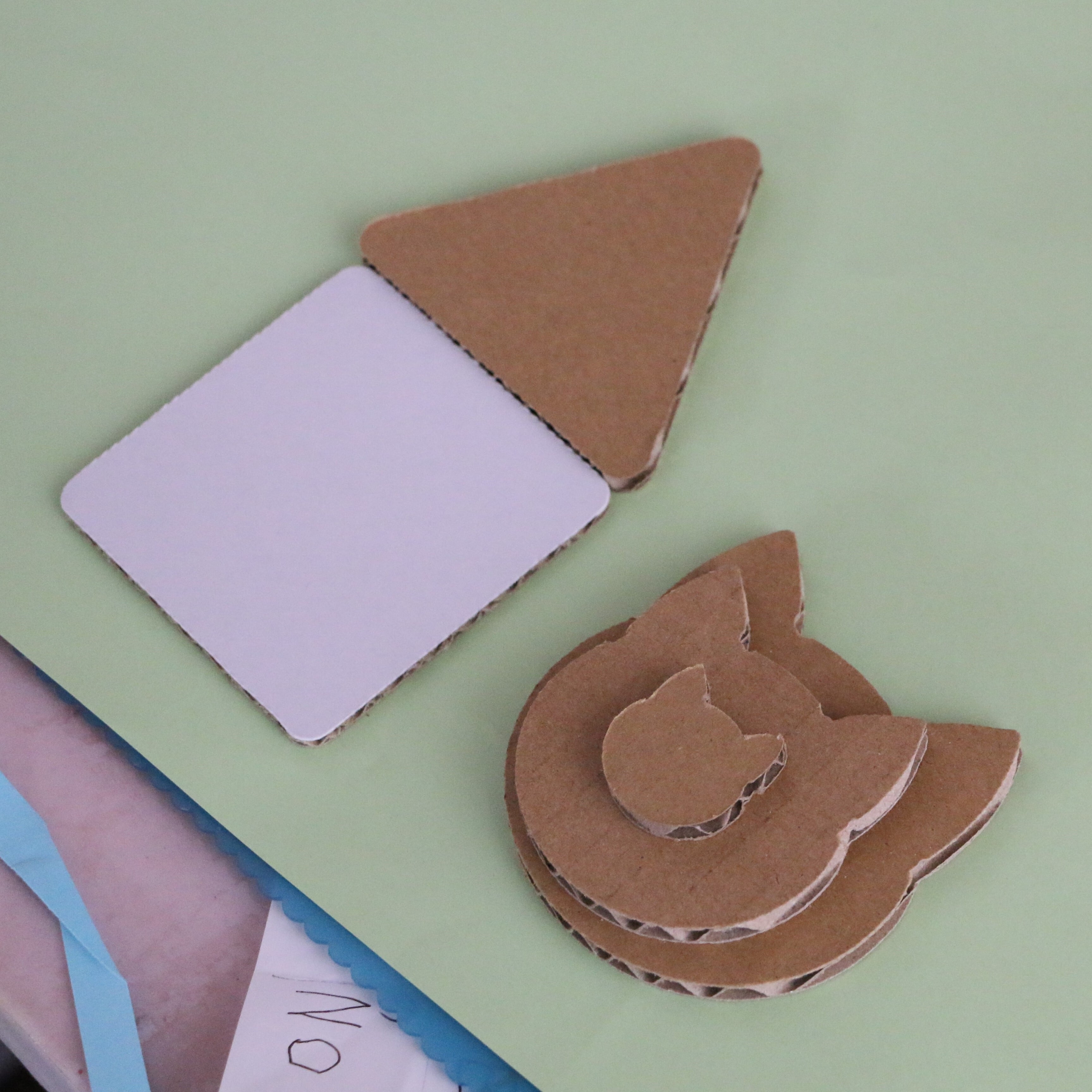 素材は基本的にダンボールで形・サイズ・厚さ(3㎜、5㎜)・色(茶、白)はいろいろです。