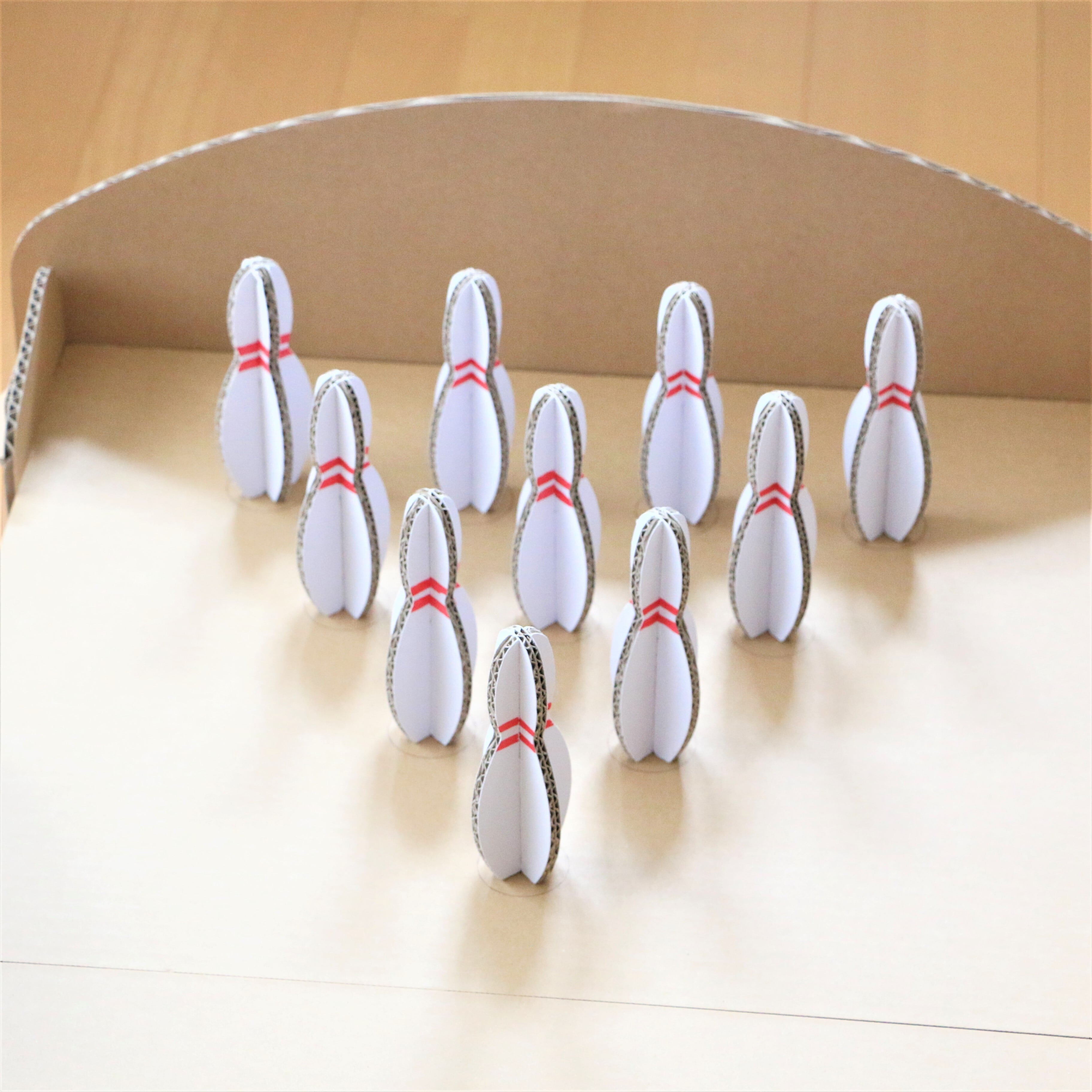 ピンやピンの配置位置など忠実に縮小再現してますので、ピンの倒れ方がとてもリアルです。(ボールはダンボールではありません。)