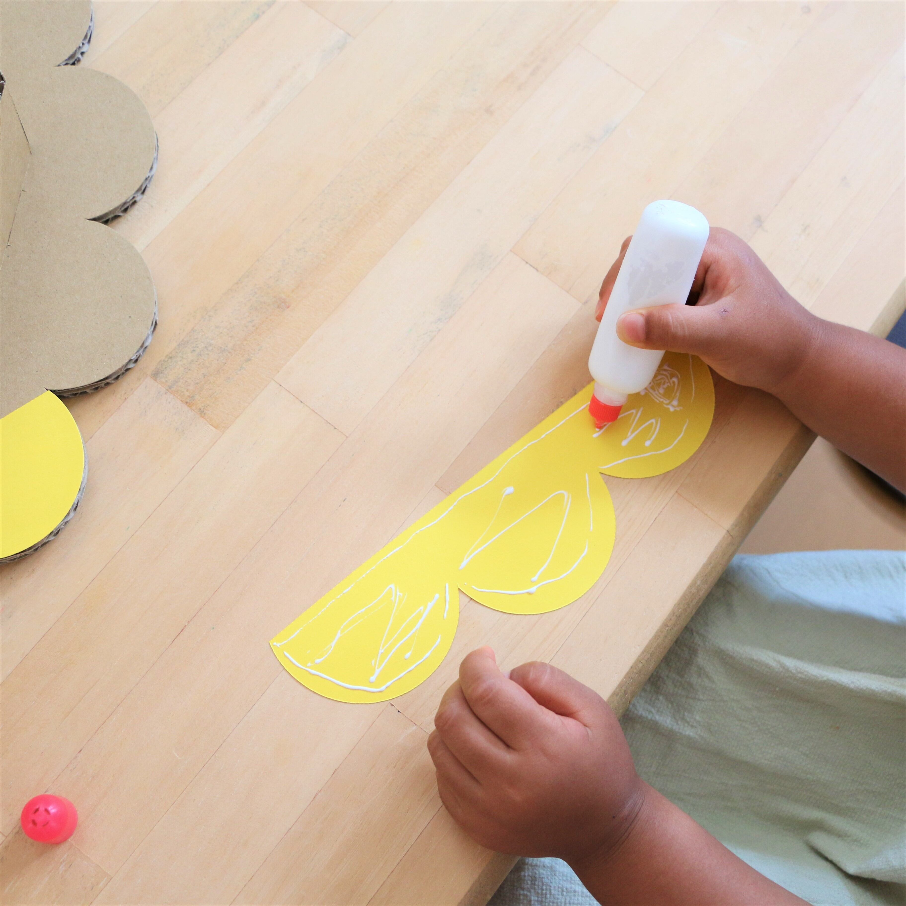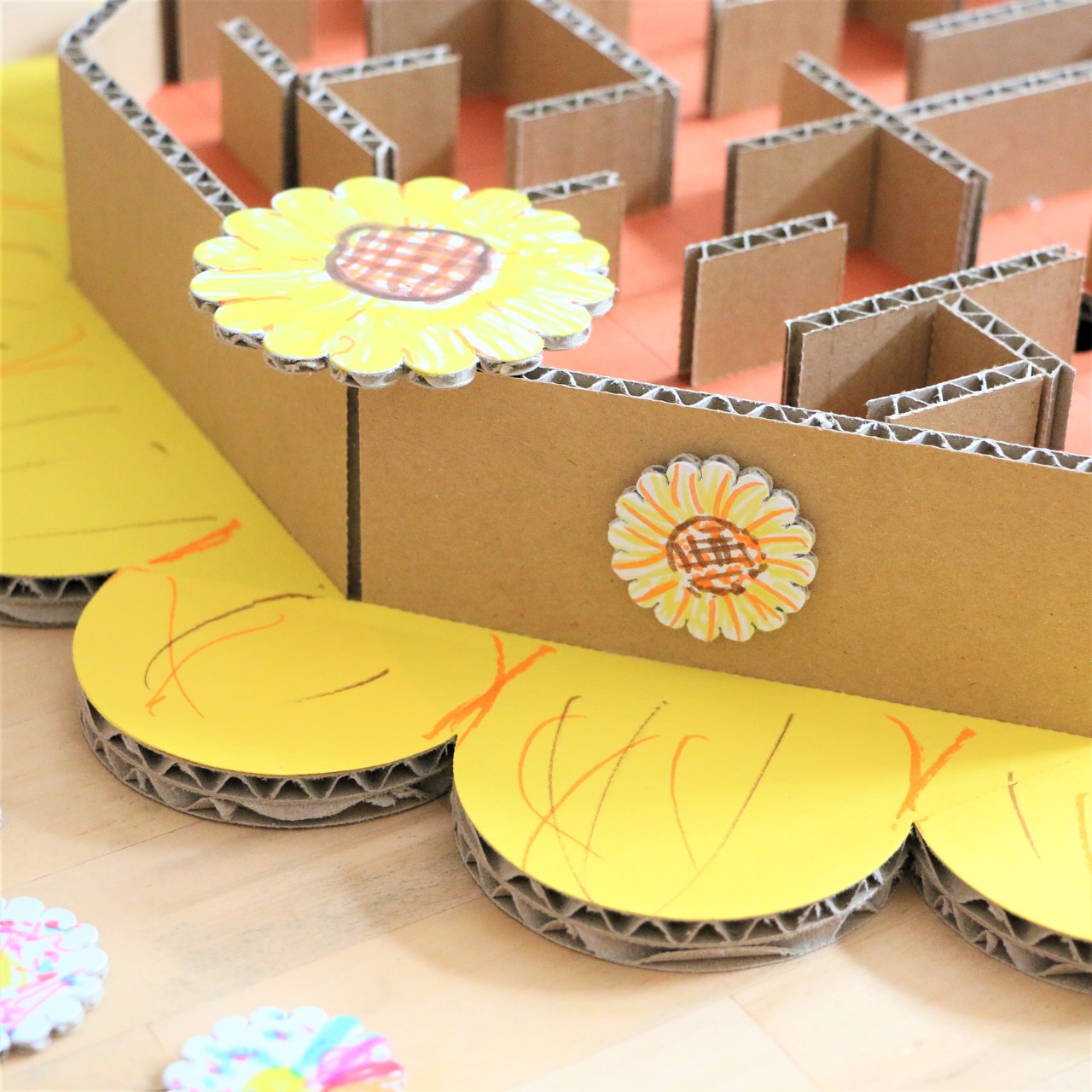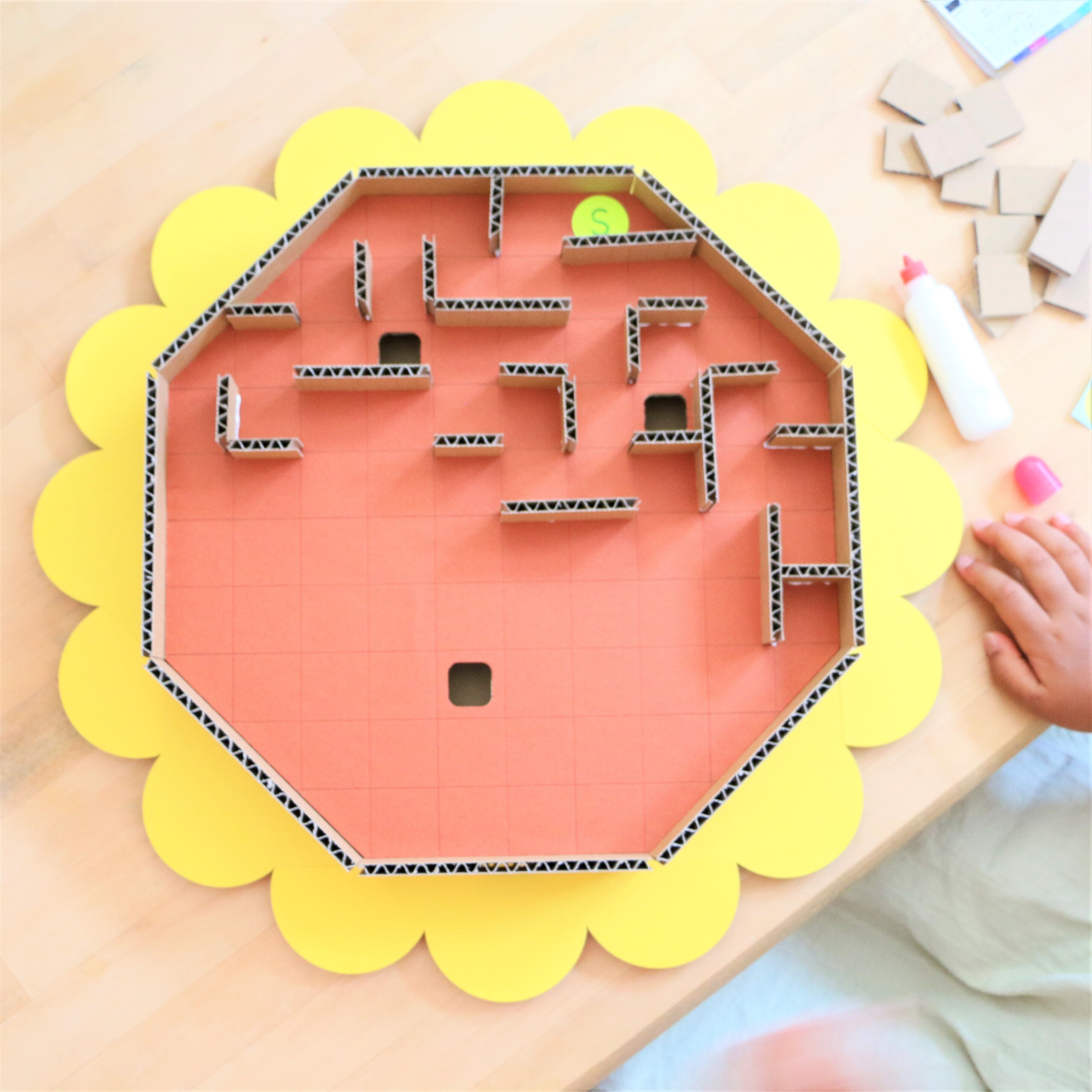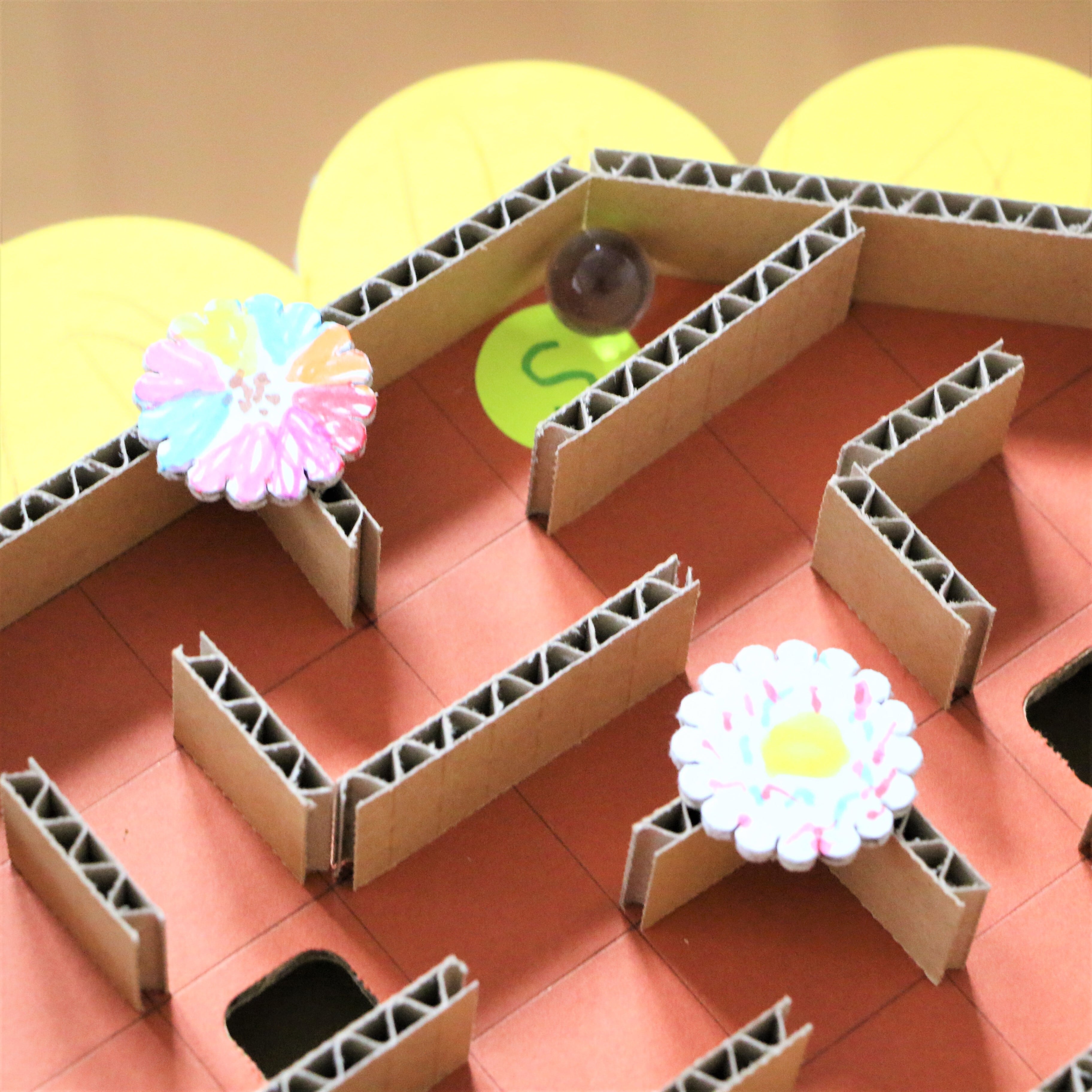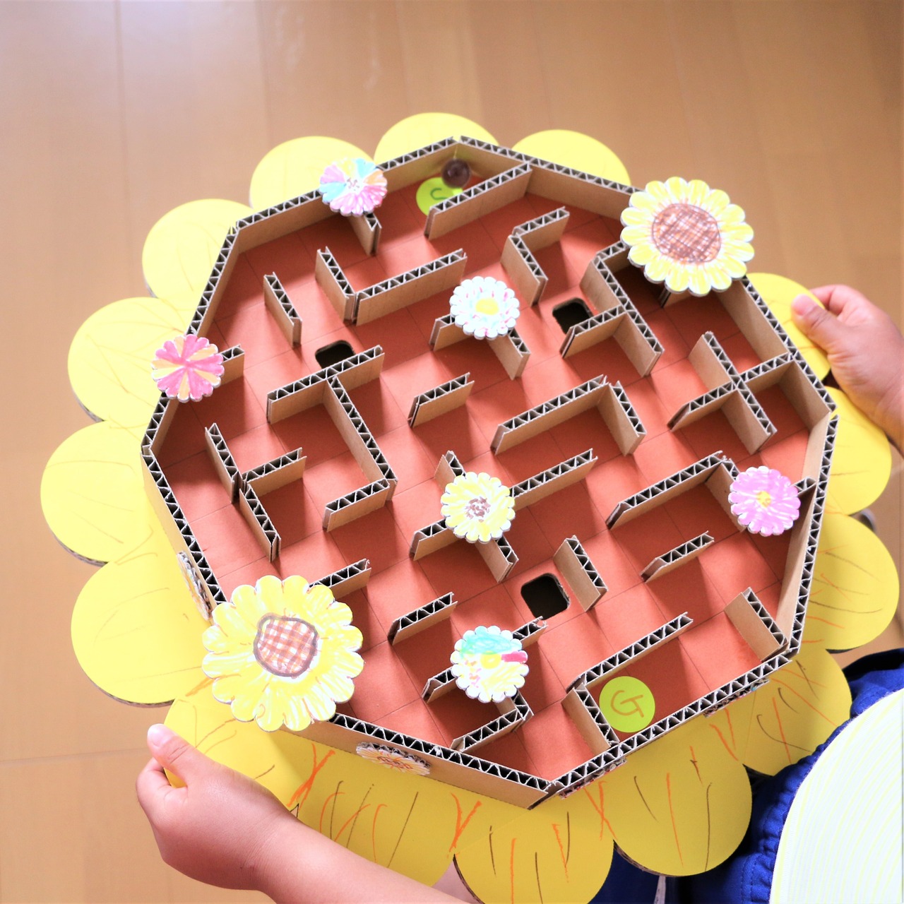 お家の中で楽しい工作をしてみてはいかがでしょう。夏休み工作にピッタリ、ビー玉コロコロ迷路キット・ひまわりバージョンがオススメです。迷路基盤に壁(ダンボールパーツ)を立て、ビー玉が転がるコースを作るビー玉コロコロ迷路キット。壁パーツに接着剤をつけて基盤の罫線に沿って貼り付けオリジナルコースを作ろう!スタートからゴールまで落とし穴に落ちずたどり着けるか⁉️レッツゴー!
