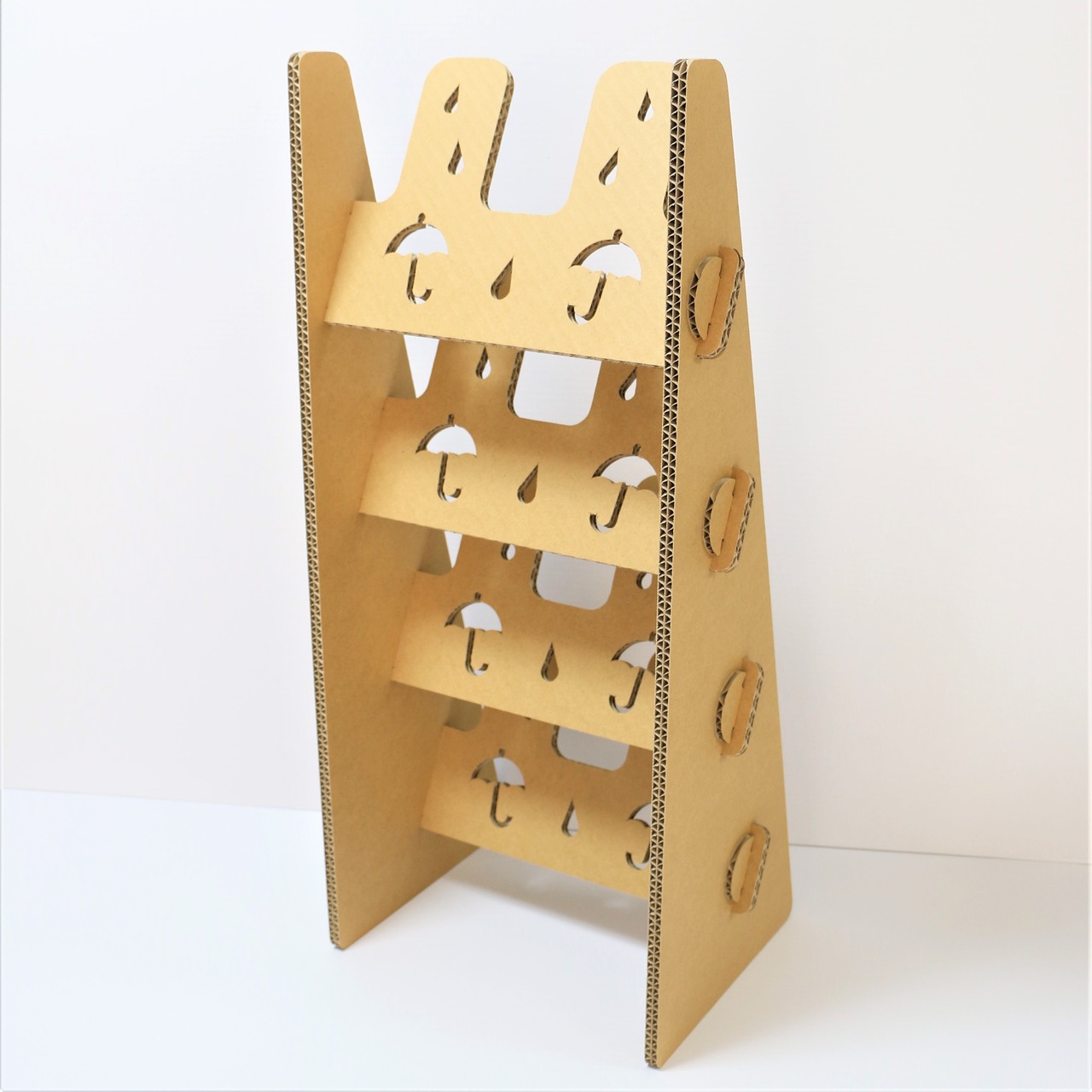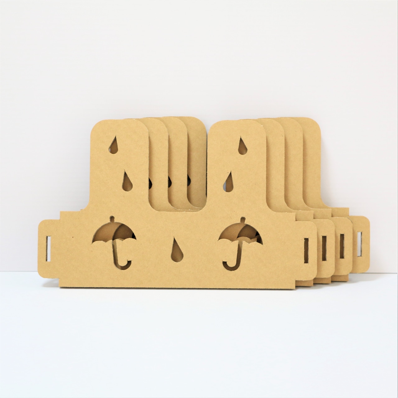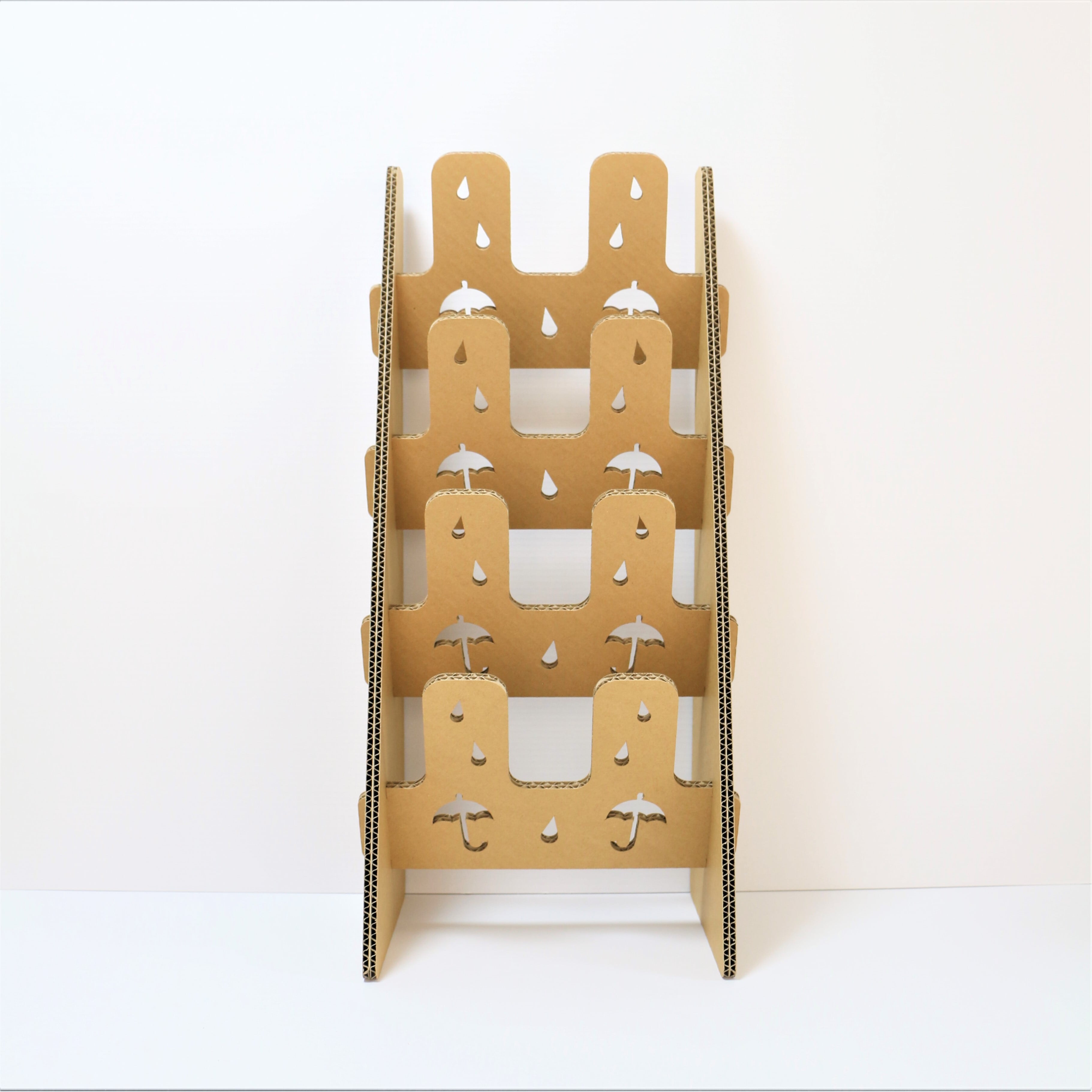素材は厚さ5㎜の強化芯ダンボールを使用し、二枚重ねの接着で丈夫かつ軽量、組み立ても簡単です。軽量で移動も楽々、お掃除も楽々、特設会場などの設置・使用に便利なスリッパラックです。傘と雨がとてもかわいいデザインになっています。
