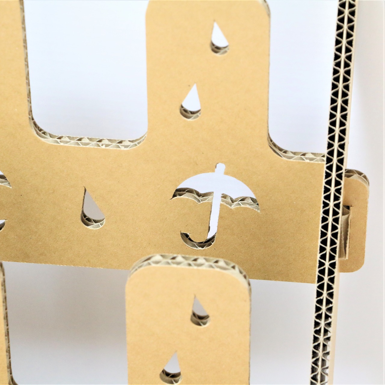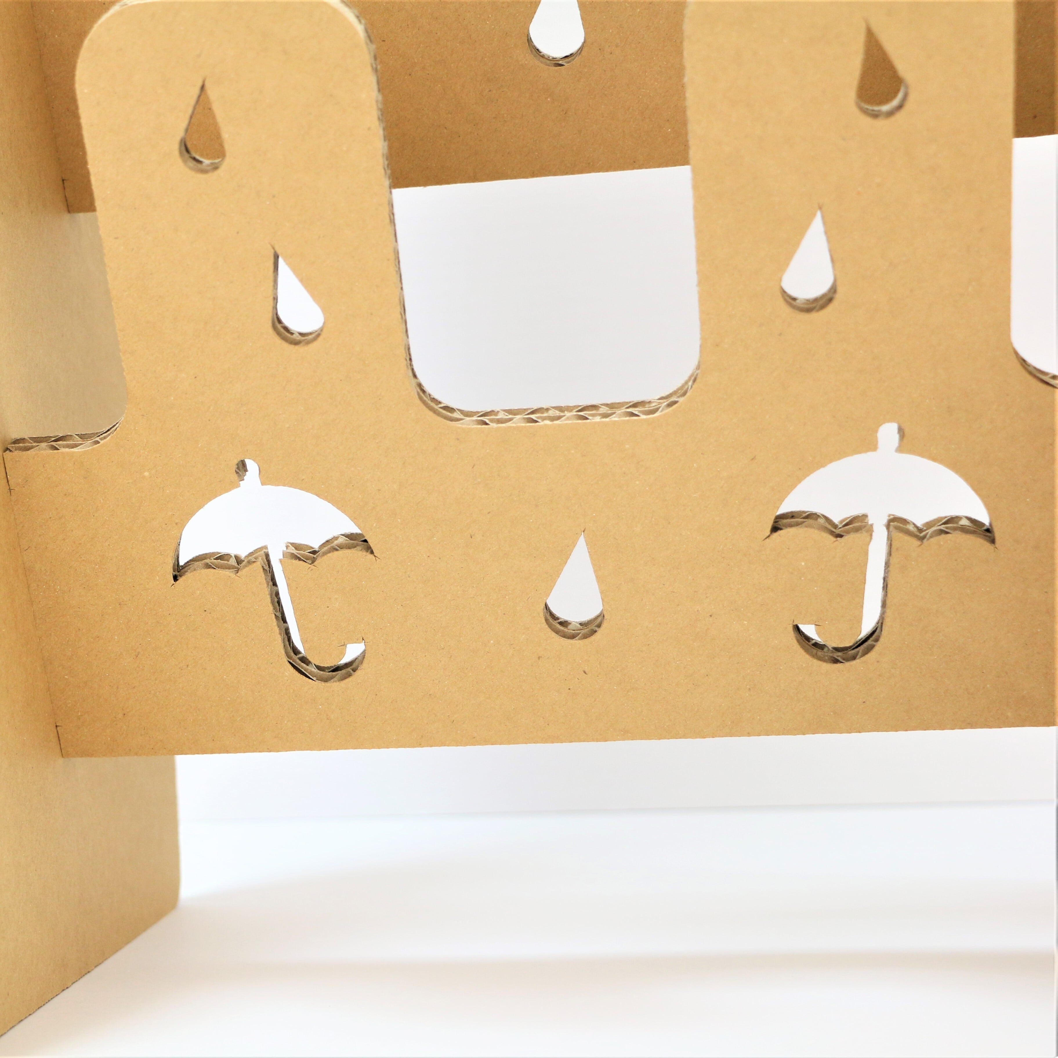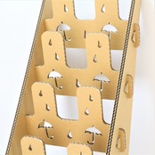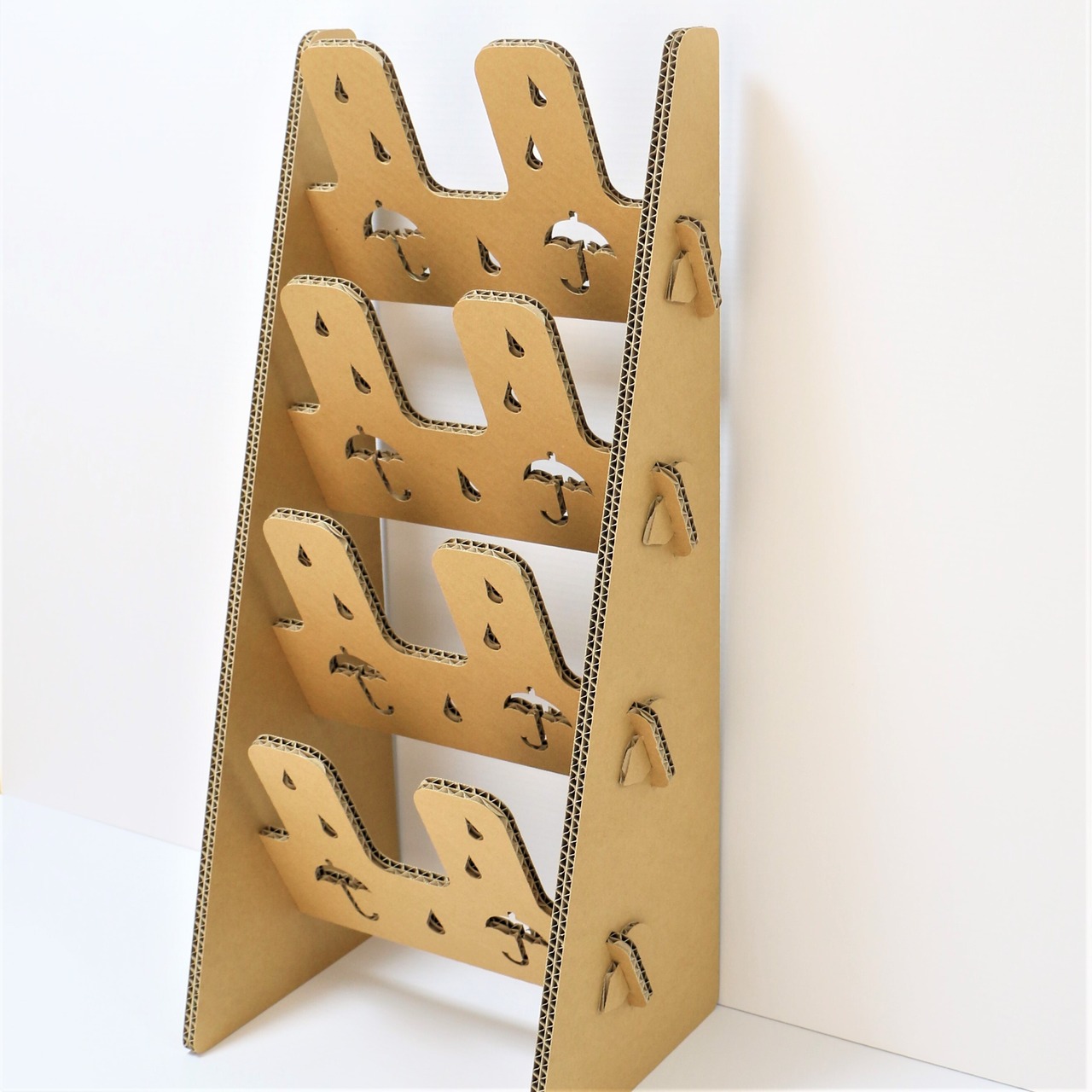 素材は厚さ5㎜の強化芯ダンボールを使用し、二枚重ねの接着で丈夫かつ軽量、組み立ても簡単です。軽量で移動も楽々、お掃除も楽々、特設会場などの設置・使用に便利なスリッパラックです。傘と雨がとてもかわいいデザインになっています。