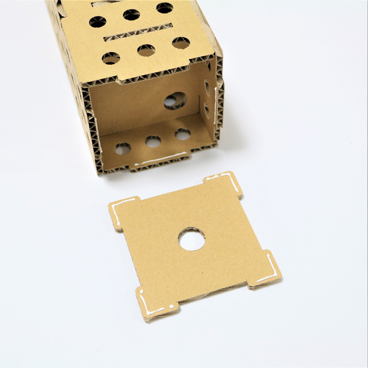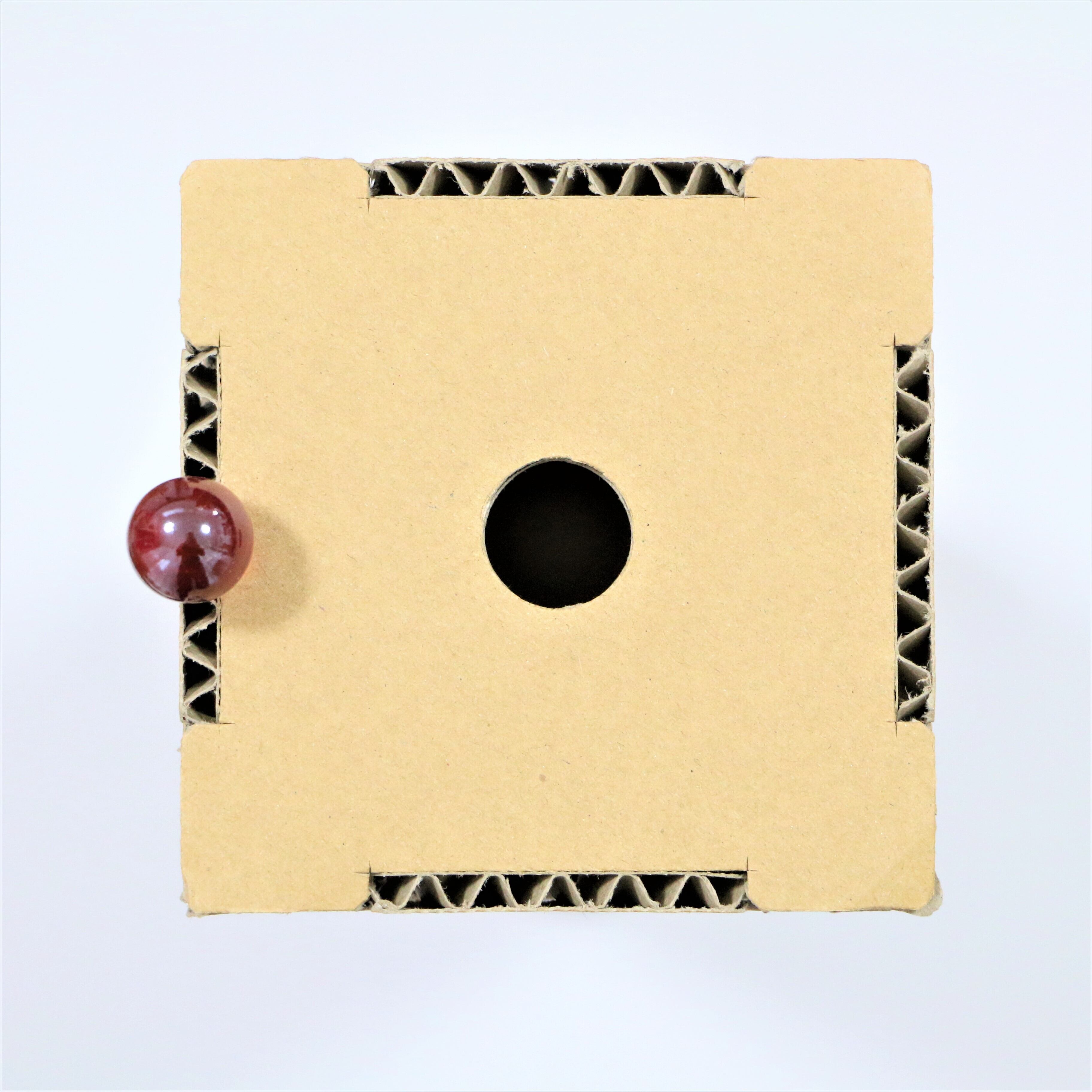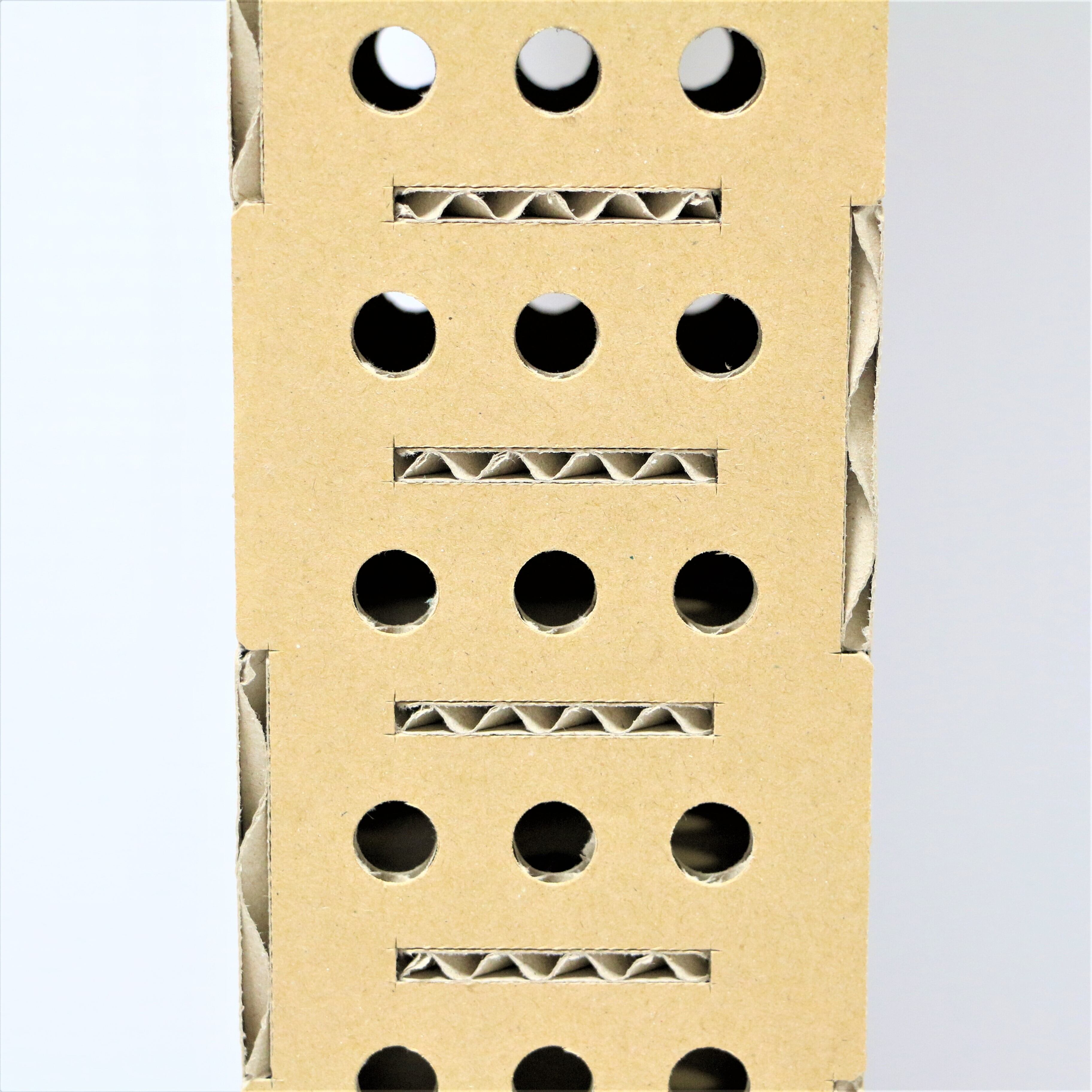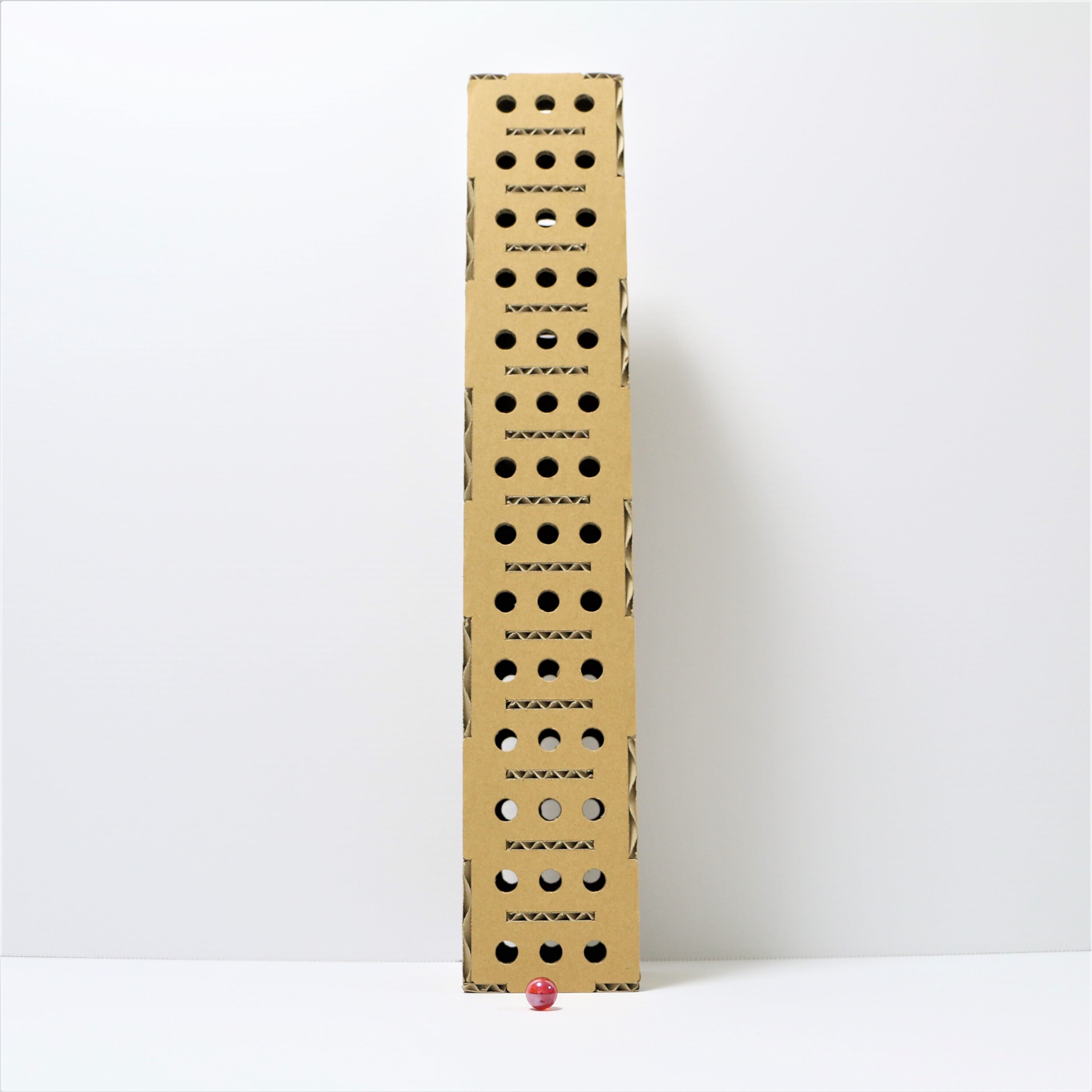 穴が開いた5種類の仕切りパーツ(ダンボール板)を一段一段差し込んでタワーが出来るので、組み合わせる順番や方向によってゲーム(ビー玉落としコース)を簡単にも難しくもできます。